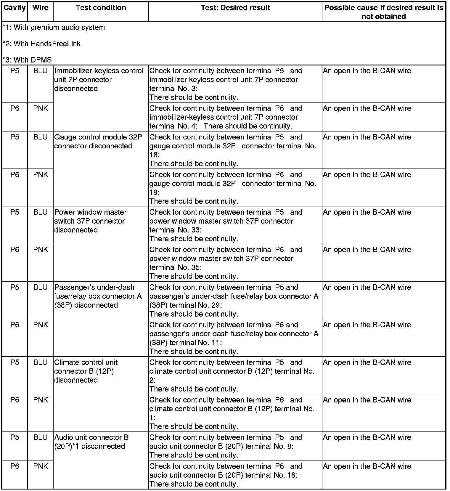 NOTE: Before testing, troubleshoot the multiplex integrated control unit first, using B-CAN System Diagnosis Test Mode A Troubleshooting - B-CAN System Diagnosis Test Mode A.