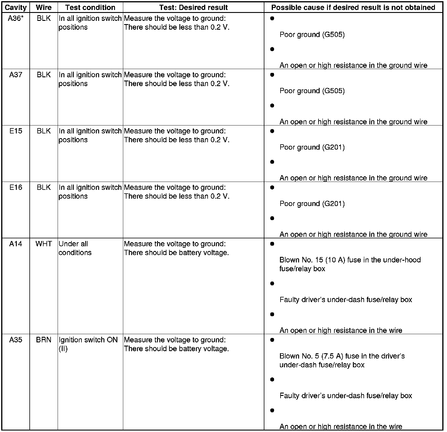5. Reconnect the connectors to the driver's under-dash fuse/relay box, turn the ignition switch to ON (II), and do the following input tests: