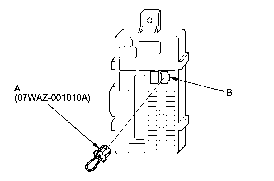 4. Connect the MPCS service connector (A) to the MICU service check connector socket (B) in the driver's under-dash fuse/relay box.