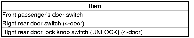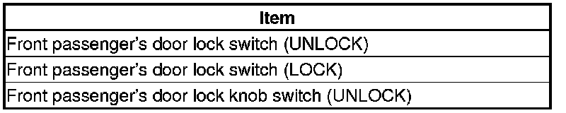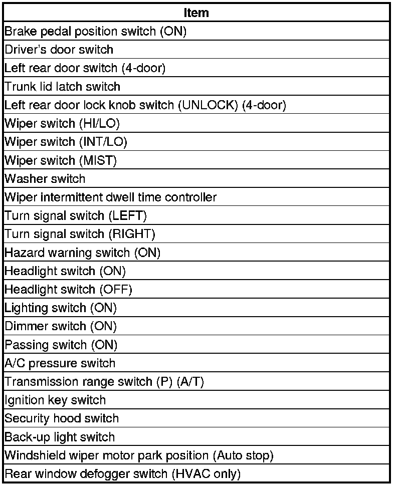11. The following tables list the circuits that can be checked in Test Mode 2. Operate the switch that is most closely related to the problem. If the circuit is OK, the ceiling light will blink once. If the circuit is faulty, there will be no indication.