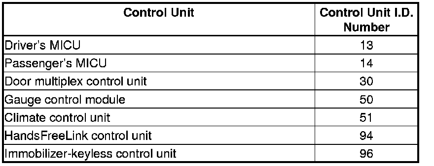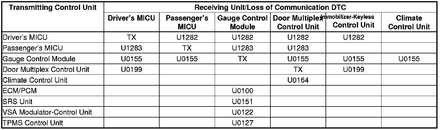 When an ECU on the CAN circuit is unable to communicate with other ECUs on the CAN circuit, the other control units will set loss of communication DTCs. Use this chart to find the control unit that is not communicating with the other control units on the CAN circuit.