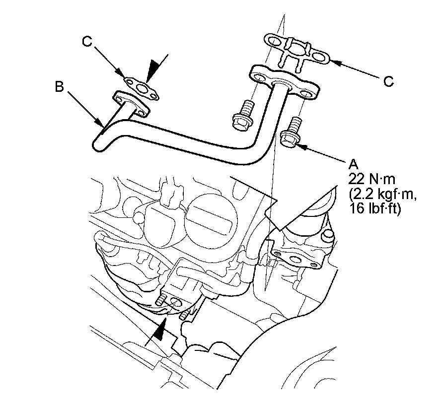 1. Set the EGR pipe (A) with new gaskets (B), and tighten the EGR pipe mounting bolts (C).