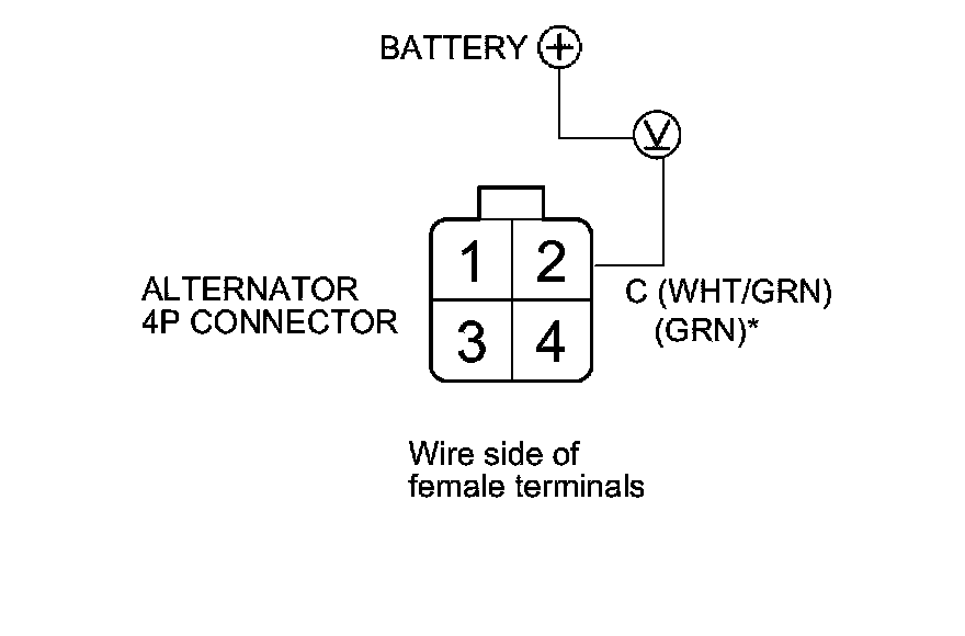 7. Measure the voltage between alternator 4P connector terminal No. 2 and the positive terminal of the battery.