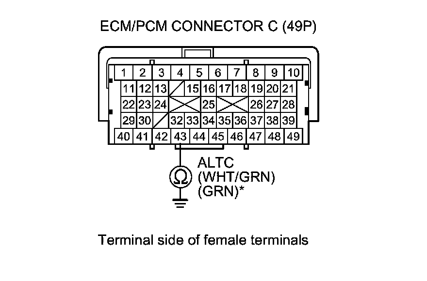 13. Check for loose terminals and connectors, then check for continuity between ECM/PCM connector terminal C43 and alternator 4P connector terminal No. 2.