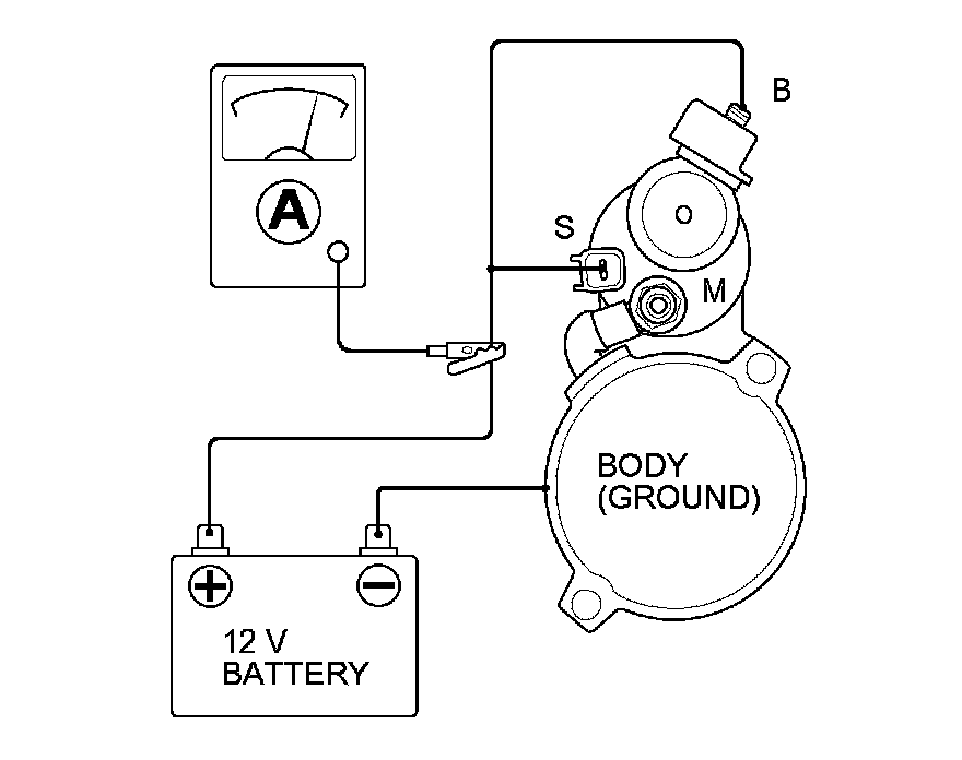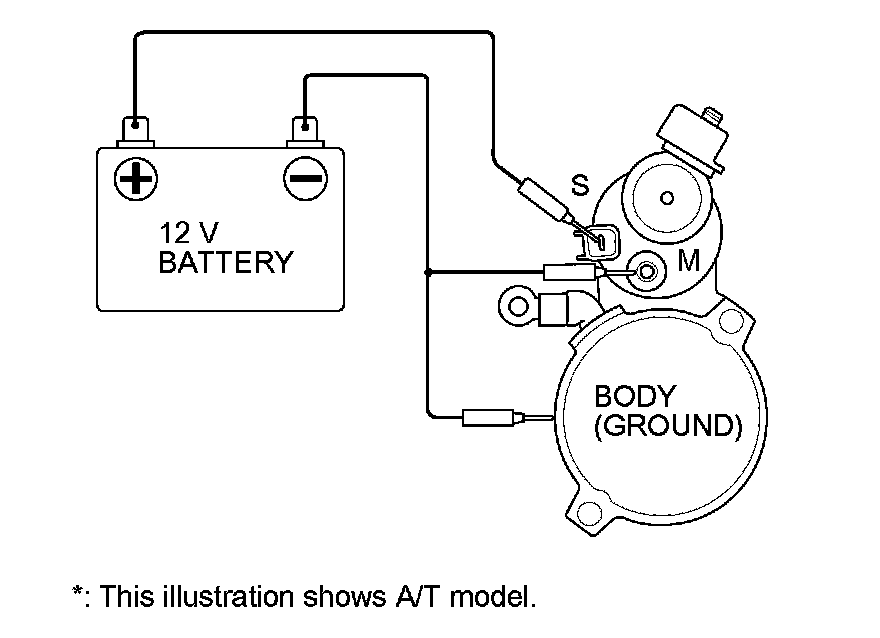 5. Connect the battery as shown. Make sure you disconnect the starter motor wire from the M terminal. If the starter pinion moves out, it is working properly.