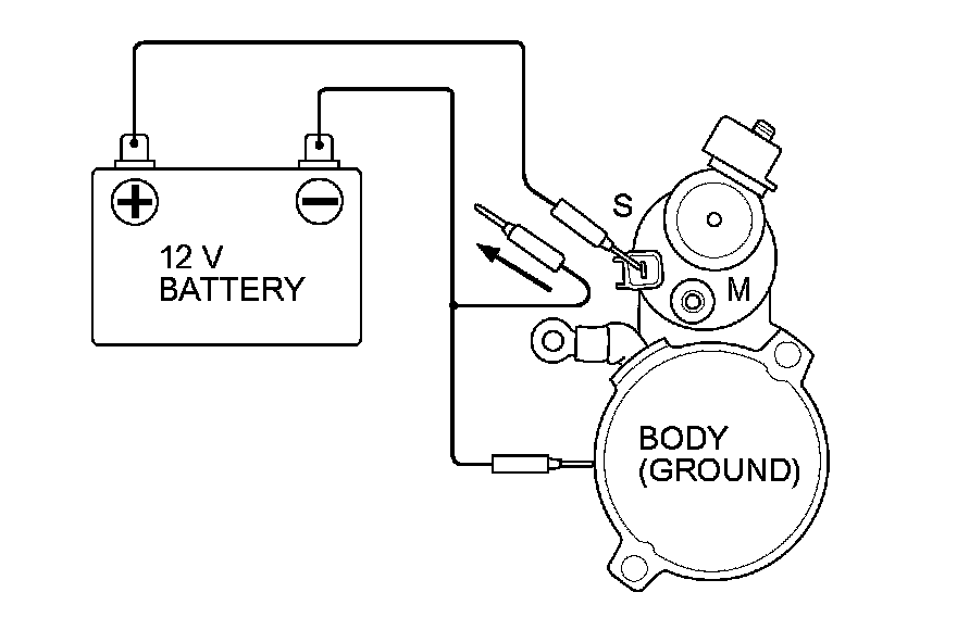 6. Disconnect the battery from the M terminal. If the pinion does not retract, the hold-in coil of the solenoid is working properly.