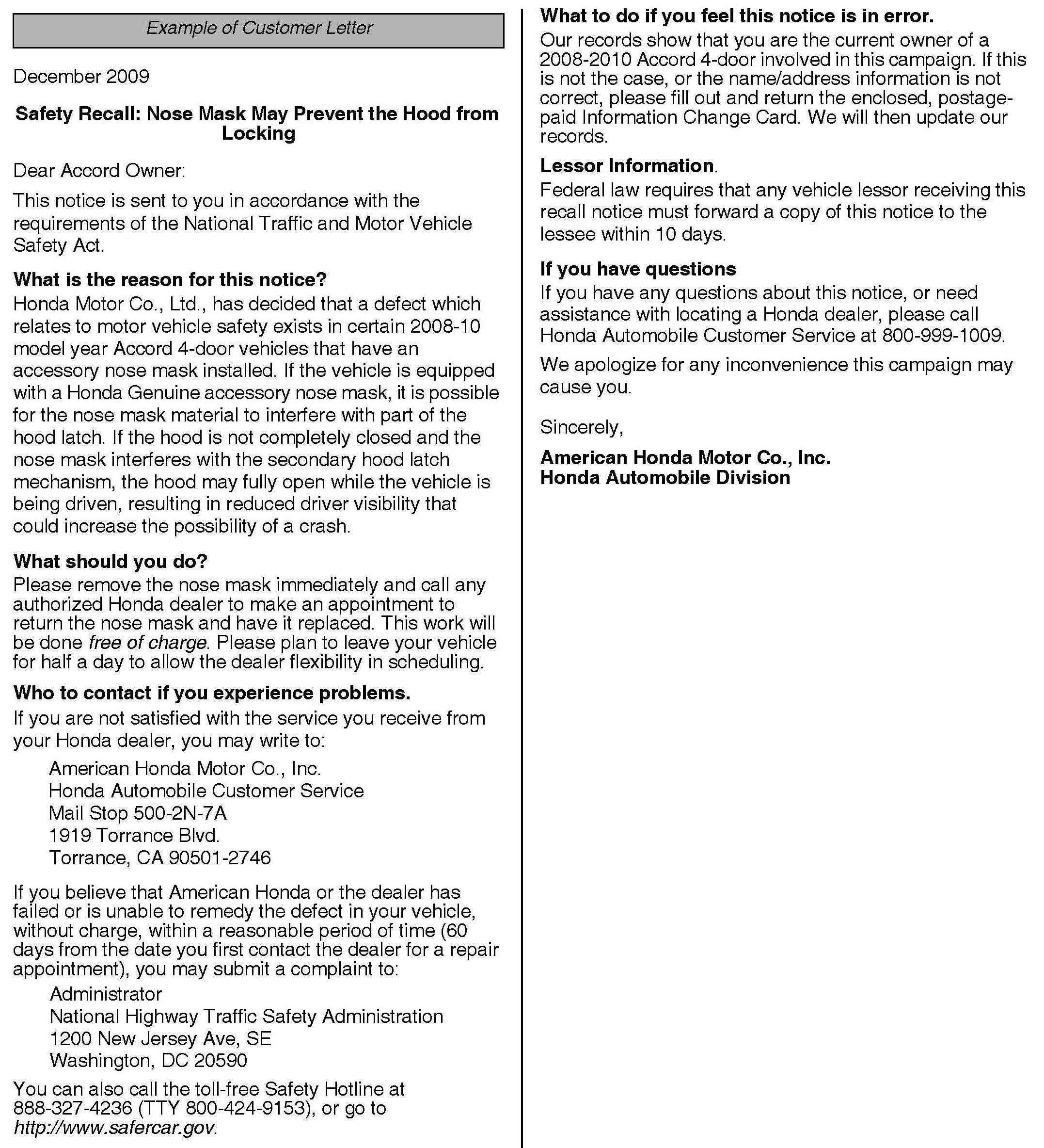 If the vehicle is equipped with a Honda Genuine accessory nose mask, it is possible for the nose mask material to interfere with part of the hood latch. If the hood is not completely closed and the nose mask interferes with the secondary hood latch mechanism, the hood may fully open while the vehicle is being driven, resulting in reduced driver visibility that could increase the possibility of a crash.