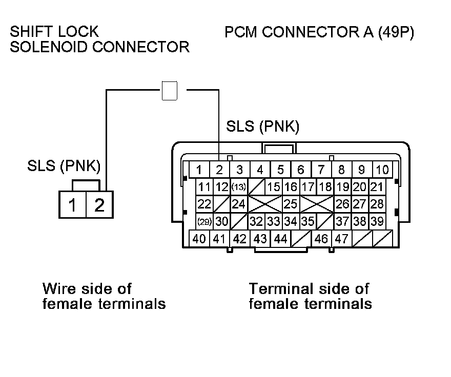 15. Check for continuity between PCM connector terminal A2 and shift lock solenoid connector terminal No. 2.