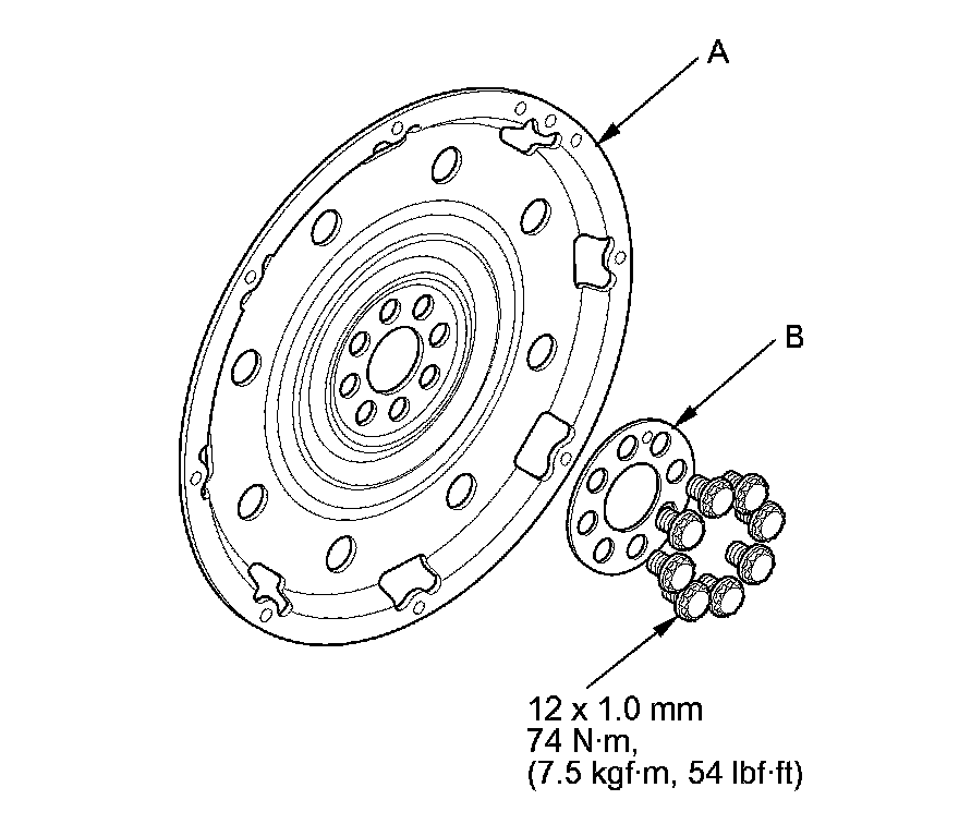 2. Remove the drive plate (A) and the washer (B) from the engine crankshaft.
