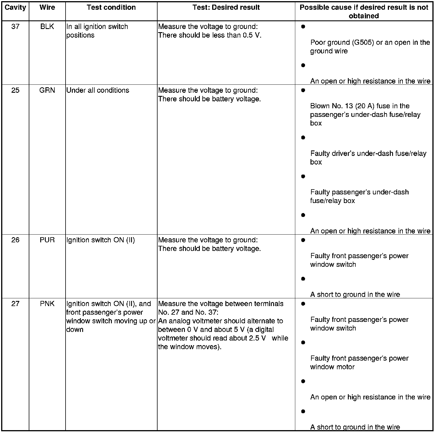 4. Reconnect the connector to the front passenger's power window switch, turn the ignition switch to ON (II), and do these input tests at the following connector.