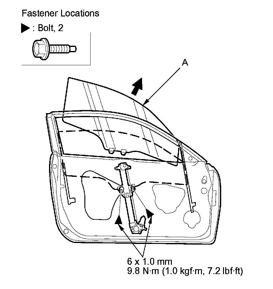 6. Lower the glass (A) until you can see the bolts, then remove them. Carefully pull the glass out through the window slot. Take care not to drop the glass inside the door.