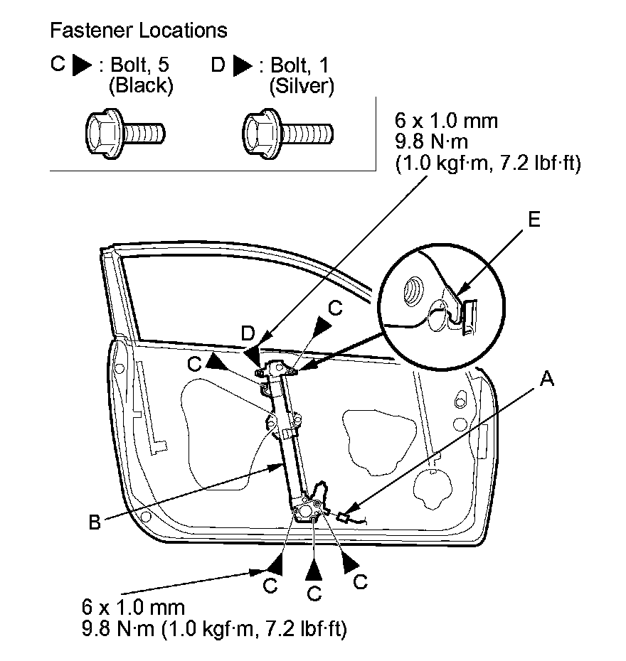 8. Remove the bolts (C), and loosen the bolts (D). Release the hook (E), then remove the regulator through the hole in the door.