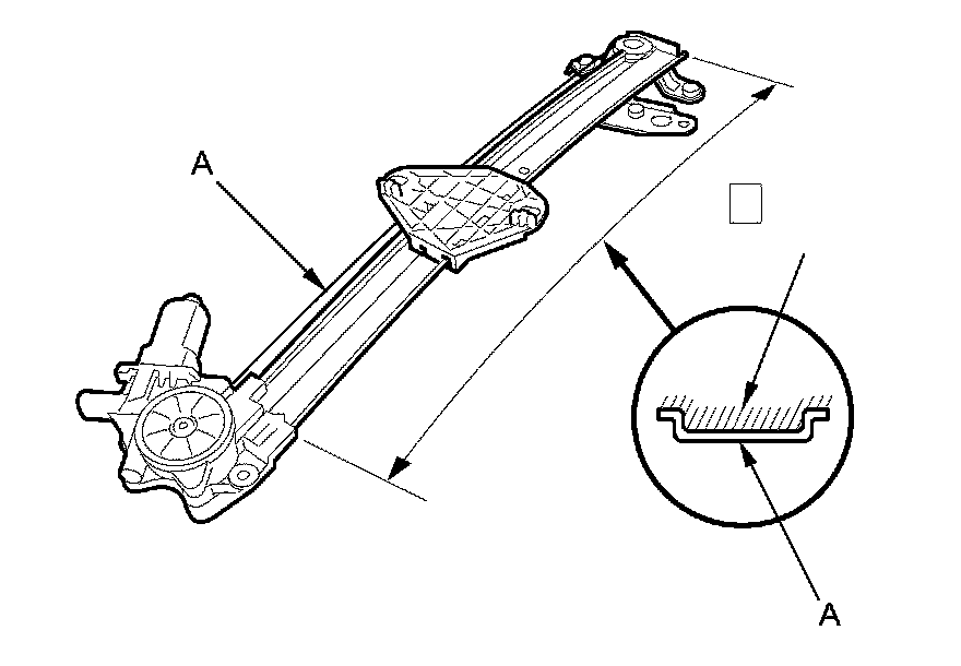 9. Apply multipurpose grease to all the sliding surfaces of the regulator (A) where shown. 4-door is shown; 2-door is similar.