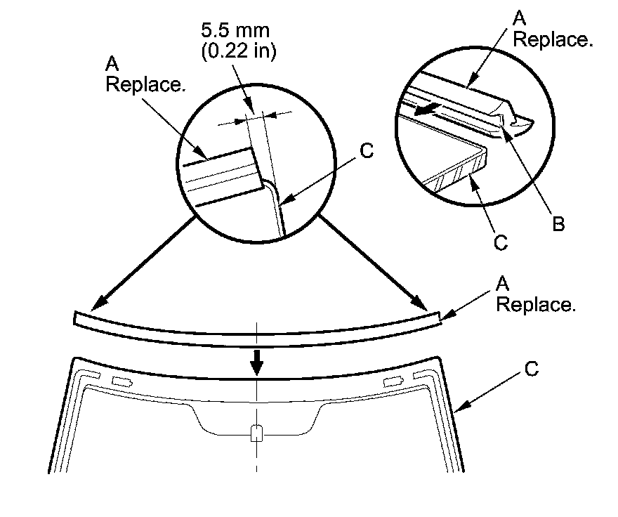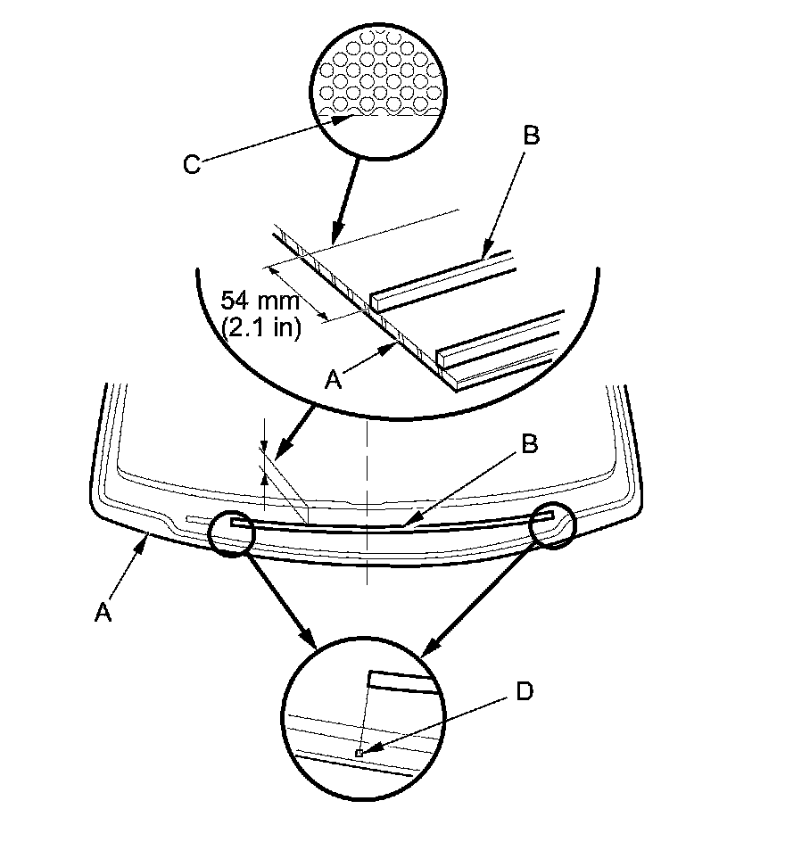 12. Apply glass primer to the upper clips mounting areas on the windshield (B), and let it dry. Remove the adhesive backing and attach the rubber dam A and the upper clips (C) to the inside of the windshield as shown: