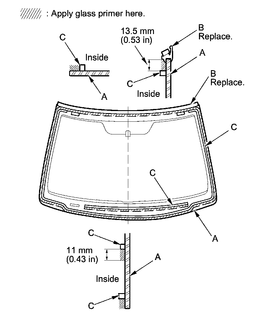 13. Attach rubber dam B with adhesive tape to the inside surface of the windshield (A) as shown, using the edge of the black ceramic-coated area (C) as a guide.