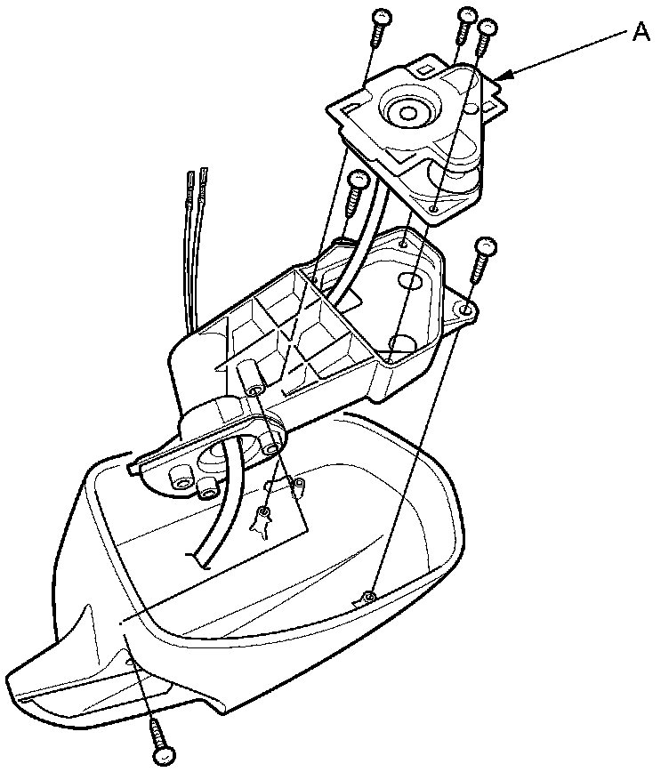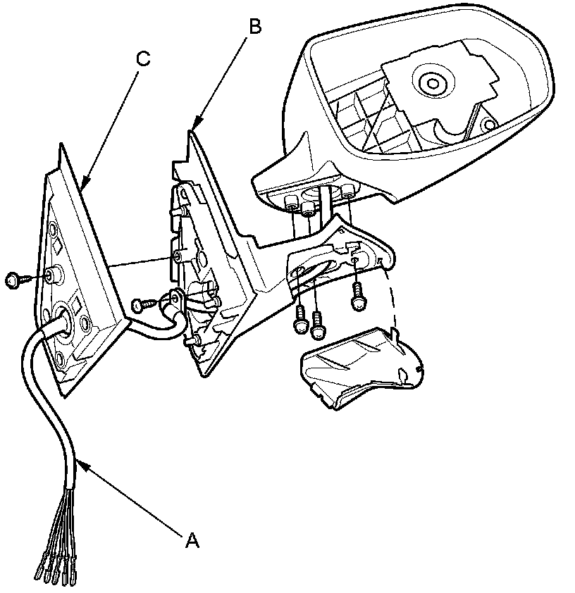 8. Remove the three screws, and separate the mirror housing (B) from the bracket (C).
