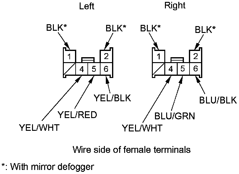 3. Record the power mirror 6P connector (A) terminal locations and wire colors.