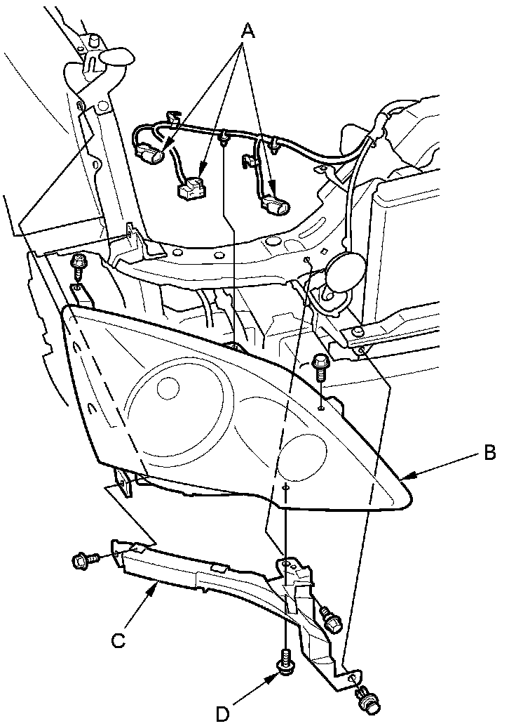 4. Remove the bolt (D) and the corner upper beam from the headlight.