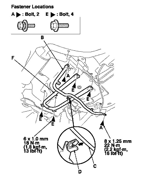 3. Release the fuel pipe (C) from the holder (D), and remove the bolts (E), then remove the under-floor brace (F).
