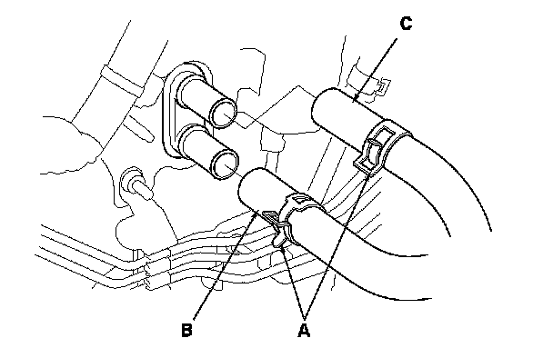 4. From under the hood, slide the hose clamps (A) back. Disconnect the inlet heater hose (B) and the outlet heater hose (C) from the heater unit. Note the layout of the hoses.