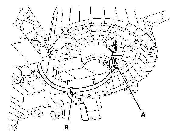 7. Disconnect the connector (A) from the blower motor. Remove the wire harness clip (B).