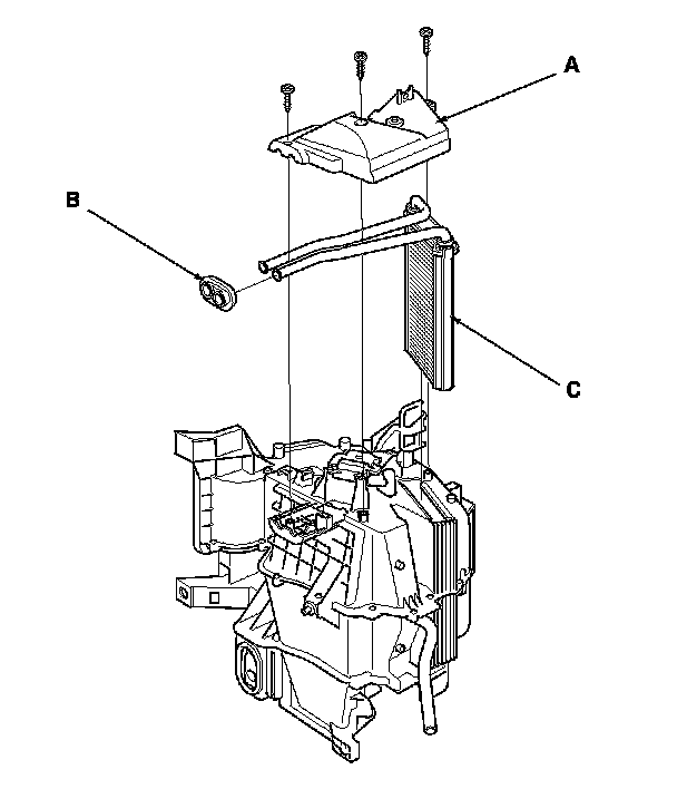 12. Remove the self-tapping screws, the heater core cover (A), the grommet (B), then carefully pull out the heater core (C).