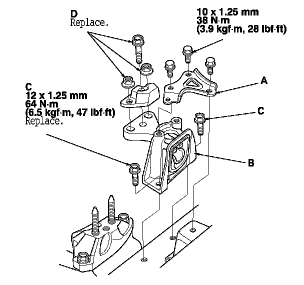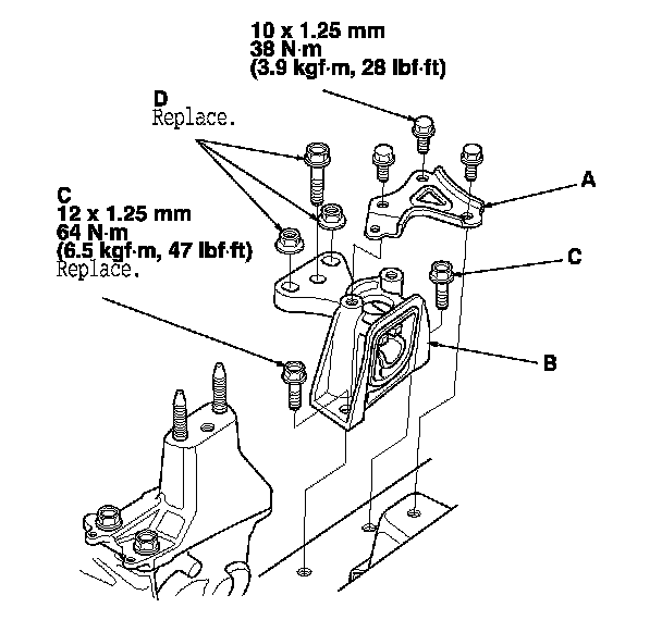 10. Install the transmission mount, and tighten the new transmission mount mounting bolts (C), then install the transmission mount stiffener.