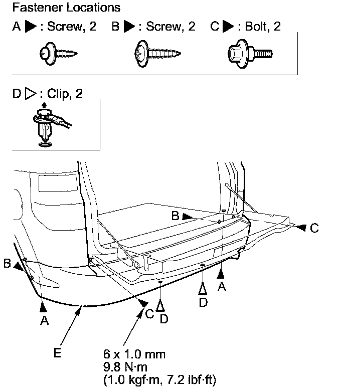 1. Remove the screws (A, B), the bolts (C) and the clips (D) securing the rear bumper (E).