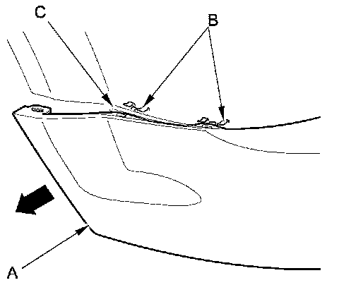 2. Pull out on the rear bumper (A) at both wheel arch areas to release it from the hooks (B) on the upper brackets (C).