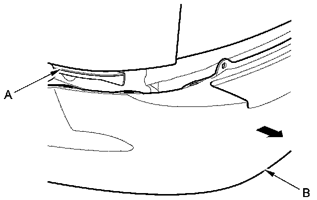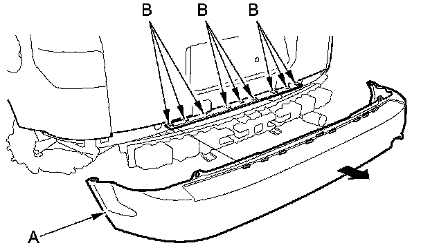4. With the help of an assistant, pull out the rear bumper (A) to release the rear bumper from the hooks (B).