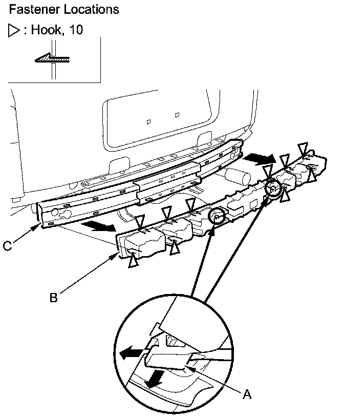 5. Release the hooks (A) on the underside of the rear bumper absorber (B) with a flat-tip screwdriver, then release the other retaining hooks. Pull out the absorber to remove it from the rear bumper beam (C).