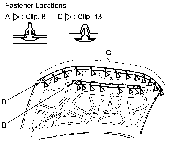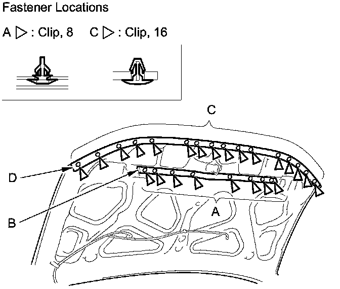 1. Detach the clips (A) with a clip remover, then remove the hood seal (B). Detach the clips (C) with a clip remover, then remove the hood front seal (D).