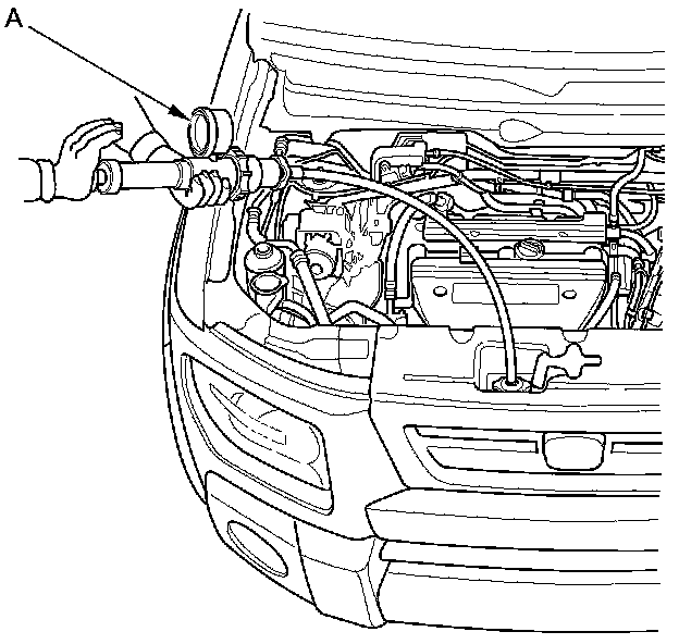 2. Attach a commercially available pressure tester (A) to the radiator, and apply a pressure of 93-123 kPa (0.95-1.25 kgf/cm2, 13.5-17.8 psi).
