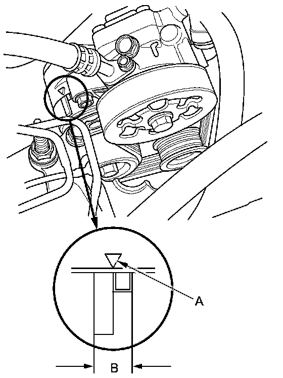 2. Check the position of the auto-tensioner indicator (A) is within the standard range (B) as shown. If it is out of the standard range, replace the drive belt Service and Repair.