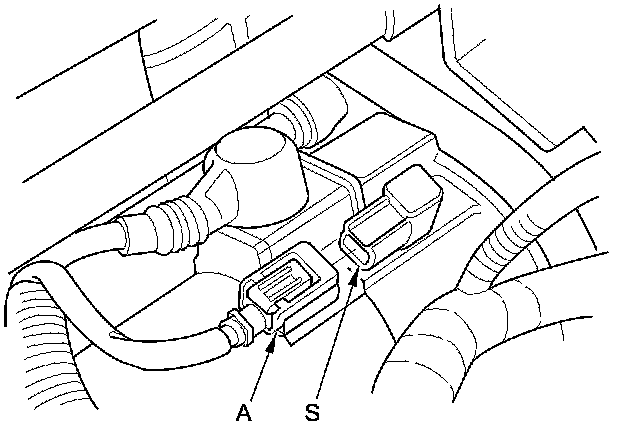 10. Make sure the shift lever is in P or N (A/T model) or neutral (M/T model), then disconnect the S terminal connector (A) from the starter S terminal. Connect a jumper wire from the battery positive terminal to the S terminal.