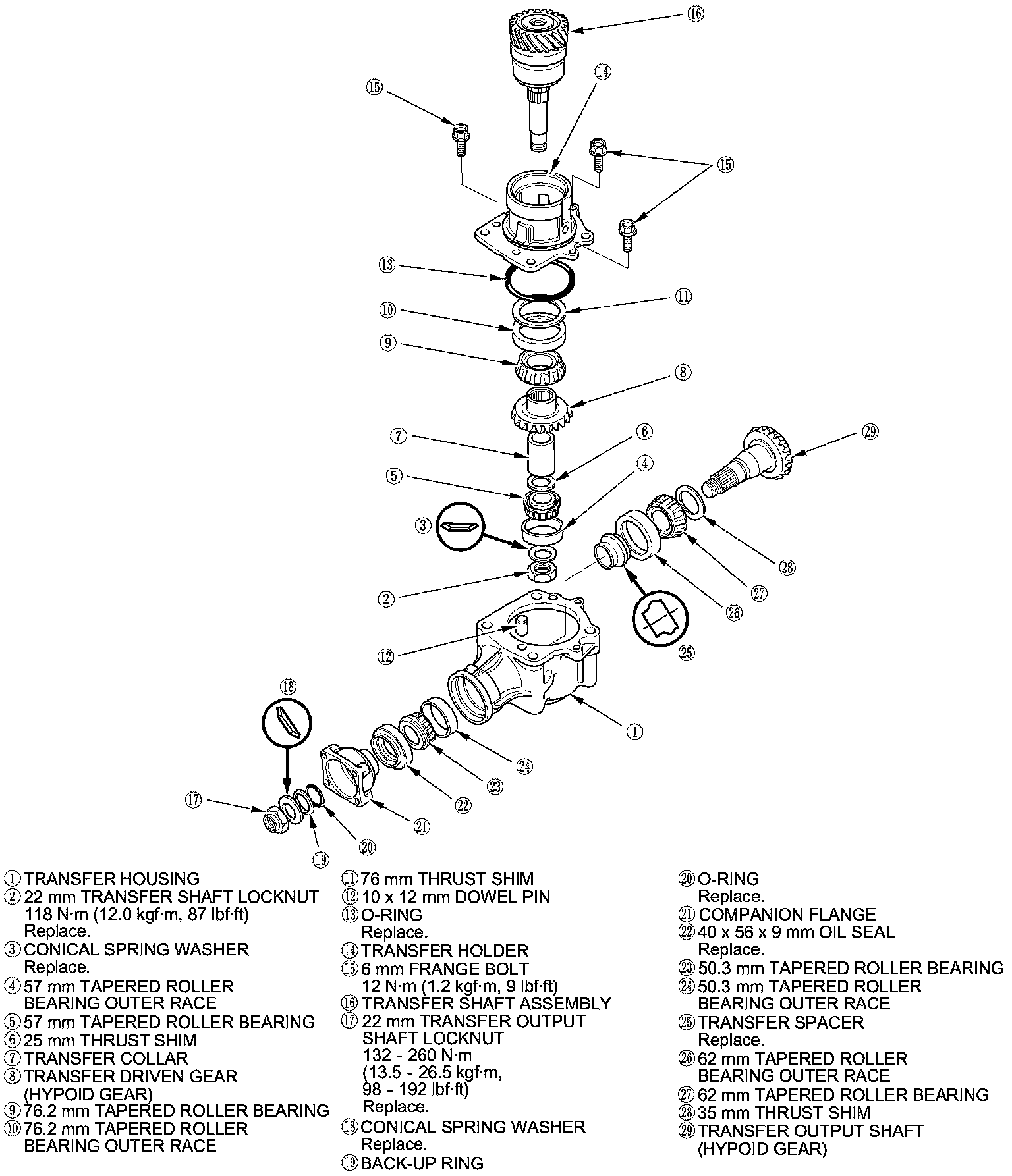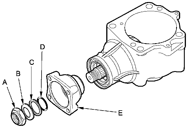 6. Remove the transfer output shaft locknut (A), the conical spring washer (B), the back-up ring (C), the O-ring (D), and the companion flange (E).