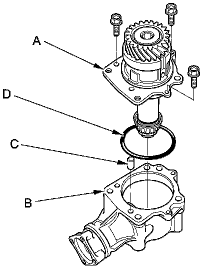 1. Remove the transfer holder assembly (A) from the transfer housing (B), then remove the 10 x 20 mm dowel pin (C) and O-ring (D).