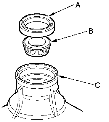 8. Remove the oil seal (A) and the 50.3 mm tapered roller bearing (B) from the transfer housing (C).