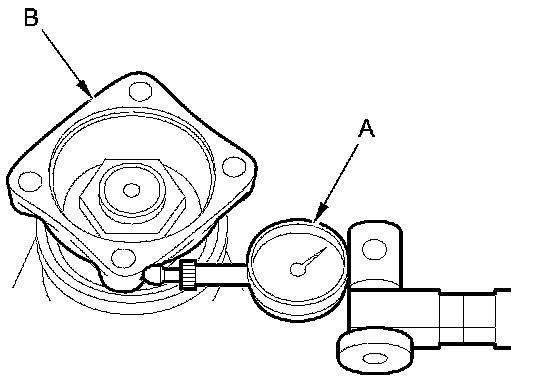2. Set a dial indicator (A) on the transfer companion flange (B) as shown.
