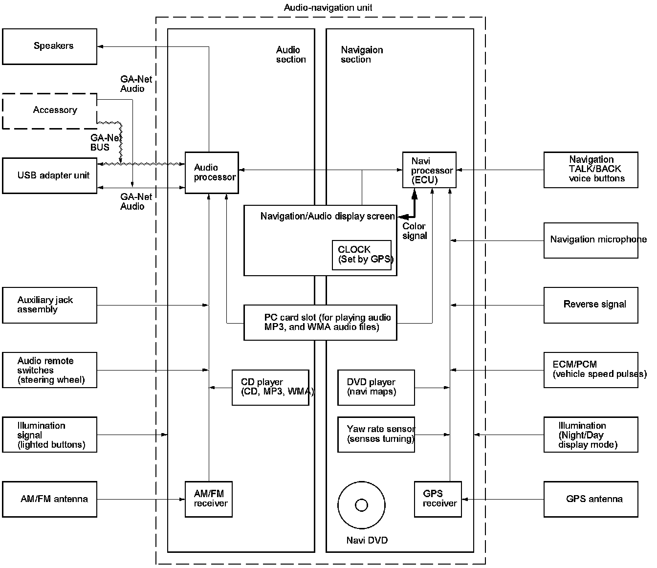 The GA-Net bus passes accessory and USB commands to the navigation unit.