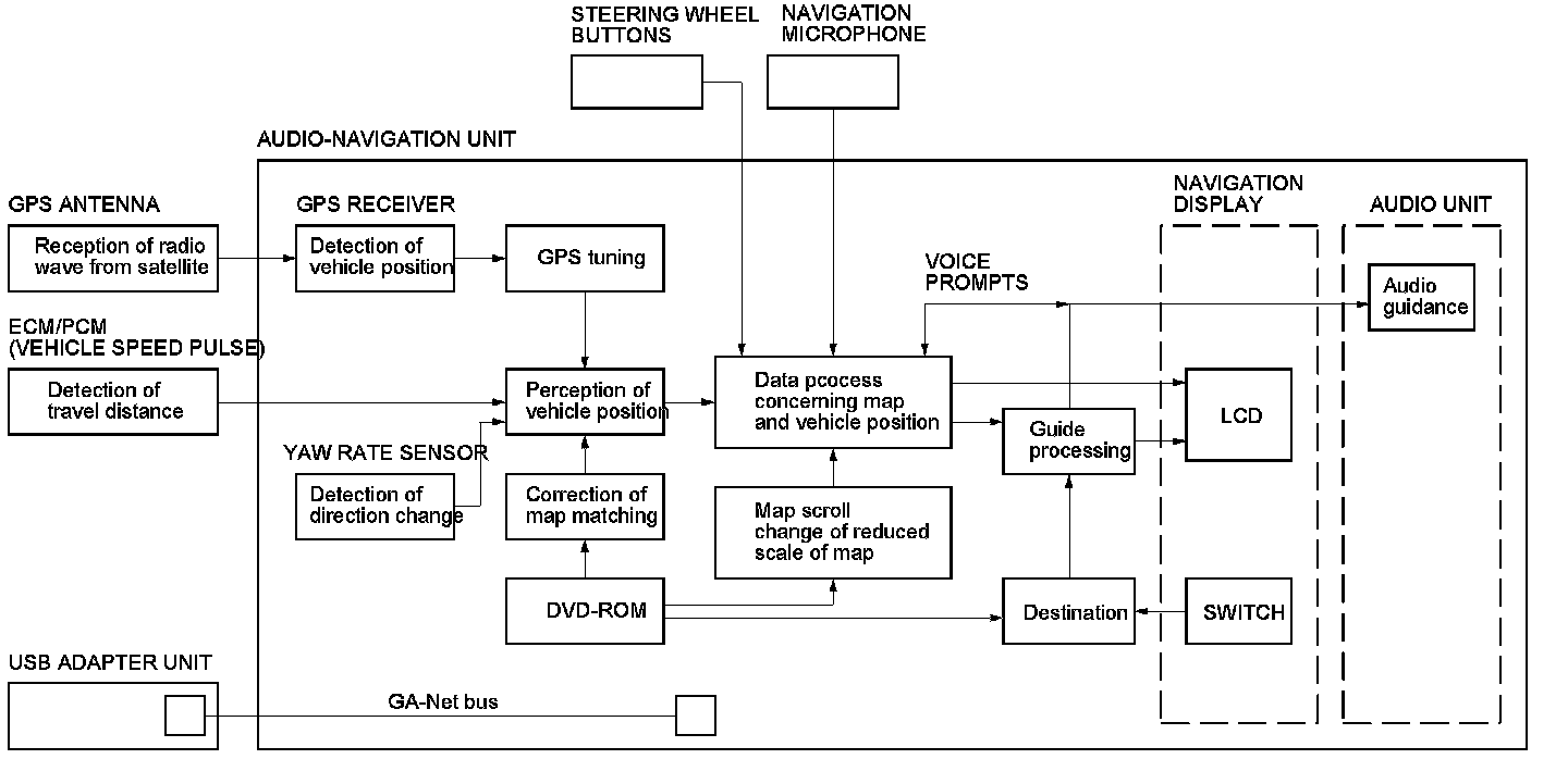 The audio-navigation unit calculates the vehicle position and guides you to the destination. The unit performs map matching correction, GPS correction, and distance tuning. It also controls the menu functions and the DVD-ROM drive, and interprets voice commands. With control of all these items, the audio-navigation unit makes the navigation picture signal, then it transmits the signal to the display panel and audio driving instructions to the audio section of the audio-navigation unit.
