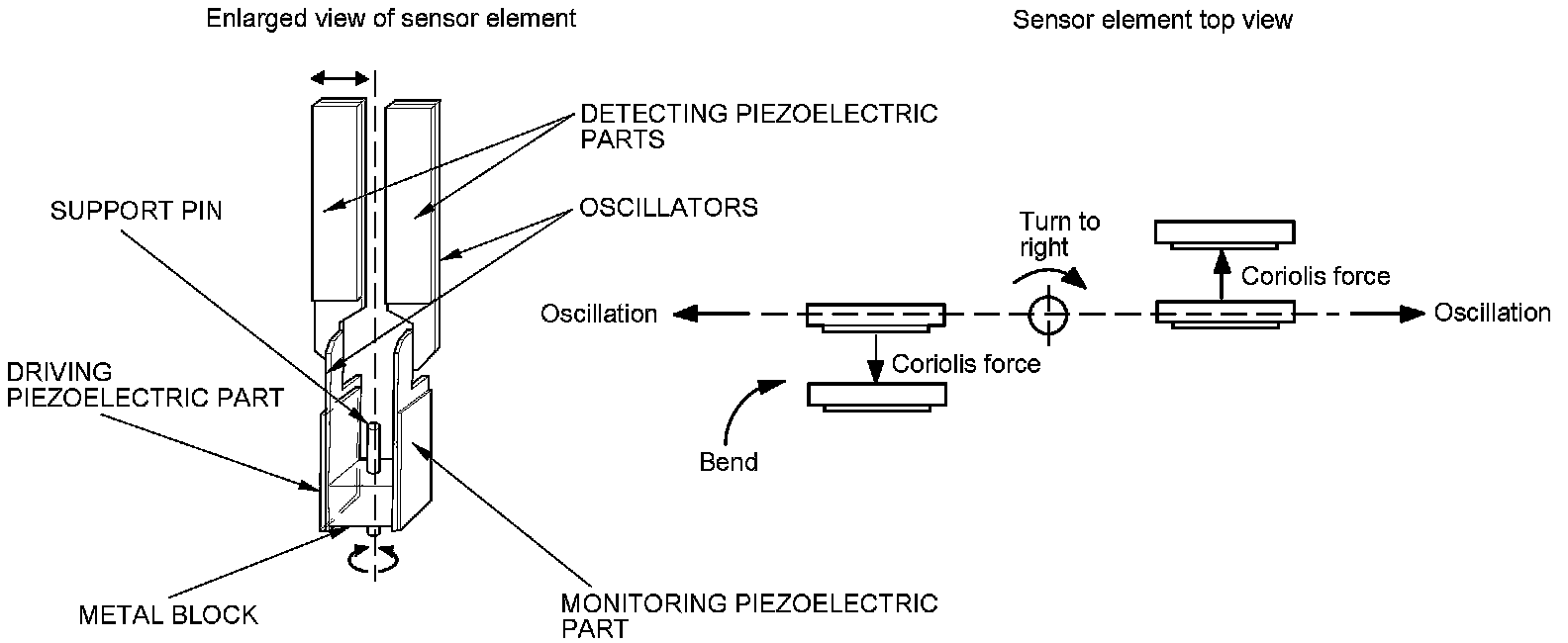 - When the vehicle turns to the right, the sensor element moves in a circular motion with the right oscillator bending forward and the left oscillator bending rearward. The amount of forward/rearward bend varies according to the angular velocity of the vehicle.
