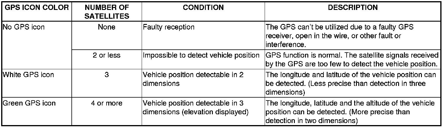 The navigation system receives signals from the global positioning system (GPS), a network of 24 satellites in orbit around the earth. By receiving signals from several of these satellites, the navigation system can determine the latitude, longitude, and elevation of the vehicle. In addition, signals from the system's yaw rate sensor and the ECM/PCM (vehicle speed pulse) enable the system to keep track of the vehicle's direction and speed of travel.