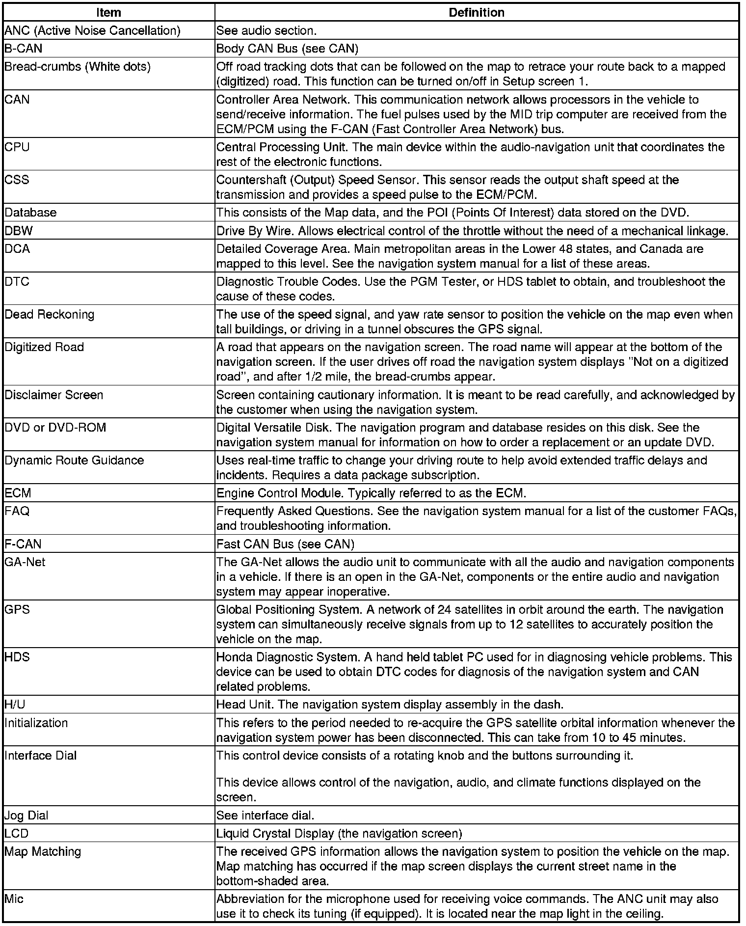 The following is a glossary of terms pertaining to the voice recognition navigation system. All items may not apply to this vehicle. See the navigation system manual for more information.