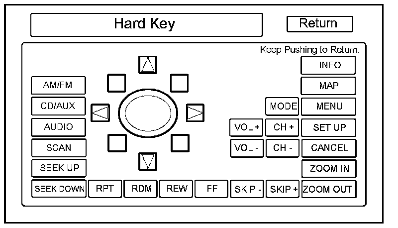 This diagnostic screen checks the status of the hard buttons surrounding the navigation display. When you press each hard button, the corresponding item on the screen should turn blue. Touch the return key, or press and hold the joystick to exit.