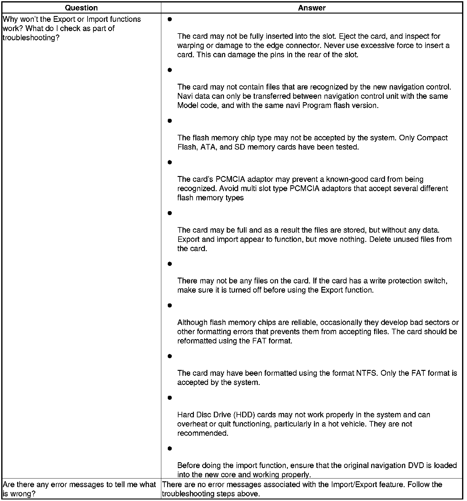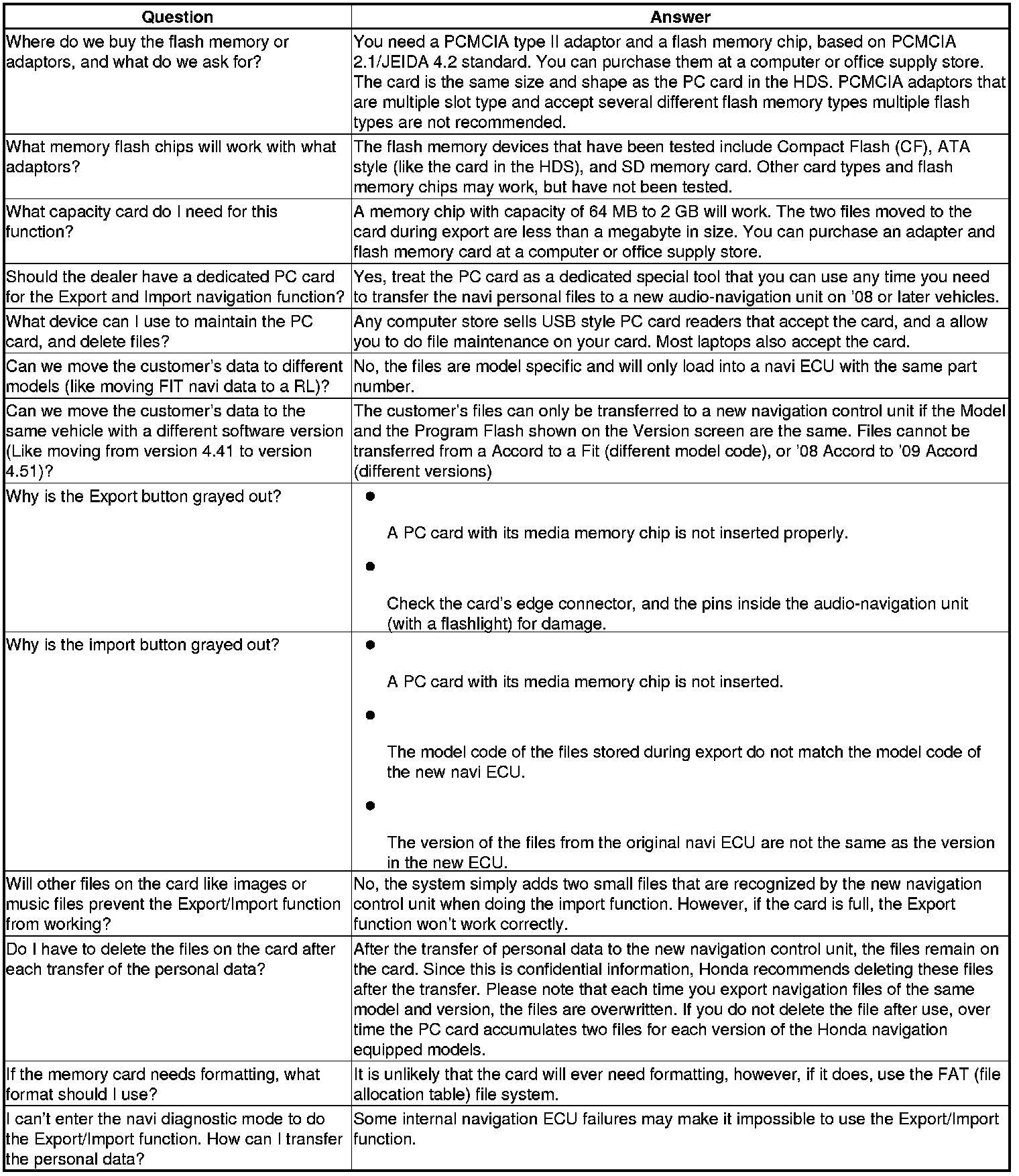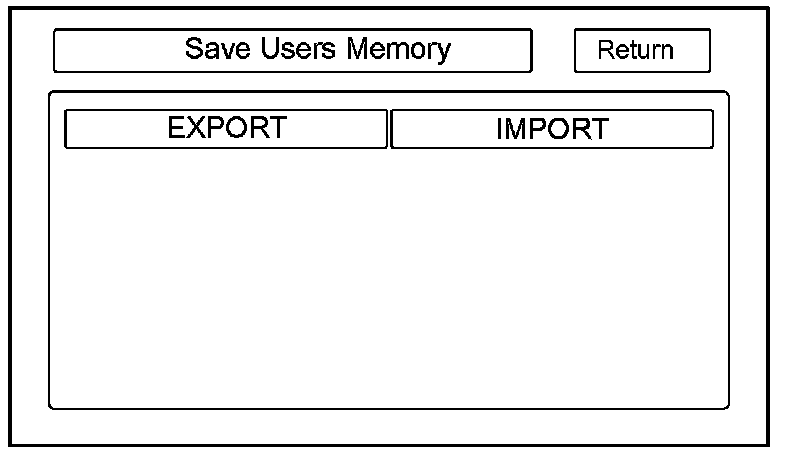 This is similar to saving and entering the customer's audio presets when replacing an audio unit. The transferred information includes their Setup settings and personal addresses. The dealer inserts a PC card (like the PC card in the HDS), and then selects the Save Users Memory function. The two functions in this diagnostic screen are Export and import. Export saves the customer's data to the PC card, and Import moves the PC card files to the new navigation core.