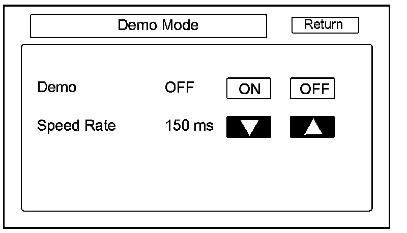 This screen is for factory use only, and should always be set to OFF. Occasionally the DEMO setting is turned ON when vehicles are being used at Auto Shows or similar events. Turning this feature on, allows the navigation system to automatically follow a route to a destination when the vehicle is stationary. The Speed changes the speed of the demo mode.