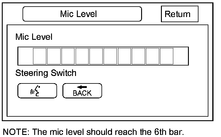 - Press the navigation TALK button on the steering wheel, wait unit you hear a beep, and in a normal voice say "testing". The TALK indicator on the screen should turn green, and the text Now Recording... should appear in yellow. If the talk indicator shown on the screen does not turn green, check the wiring from the steering wheel navigation TALK button to the audio-navigation unit. If there is no Mic Level movement when you speak, then you should check the wires running from the microphone in the roof console to the audio-navigation unit. If the wires are OK, the microphone must be faulty; replace the microphone located in individual map light Service and Repair.