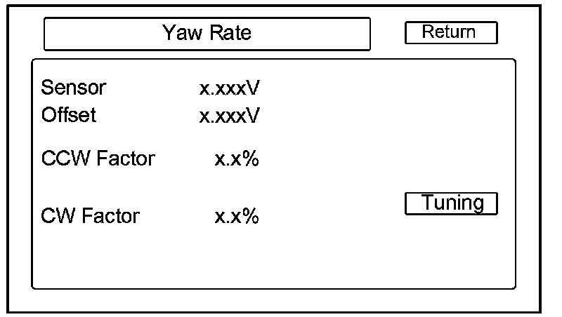 This screen gives a quick test of the yaw sensor functionality based on the two voltages Sensor and Offset. For more information see the Yaw Rate Diagnostic.