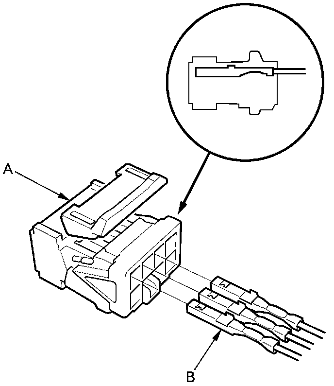 3. Disassemble the power mirror connector (A), and remove the terminals (B) from the connector.
